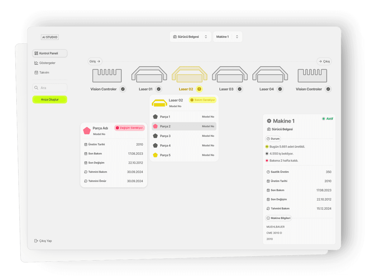 Kontrol paneli ile makineler hakkında temel bilgiler, saatlik üretim sayısı, kaç iş beklediği, günlük üretim sayısı, bakım ve değişim durumları görüntülenir.