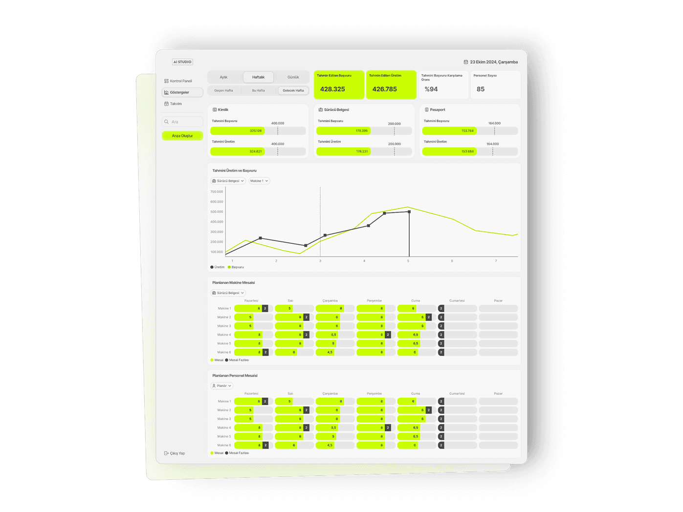 Göstergeler ile ek mesai, üretim miktarı gibi bilgiler tahminlenir ve planlanır.