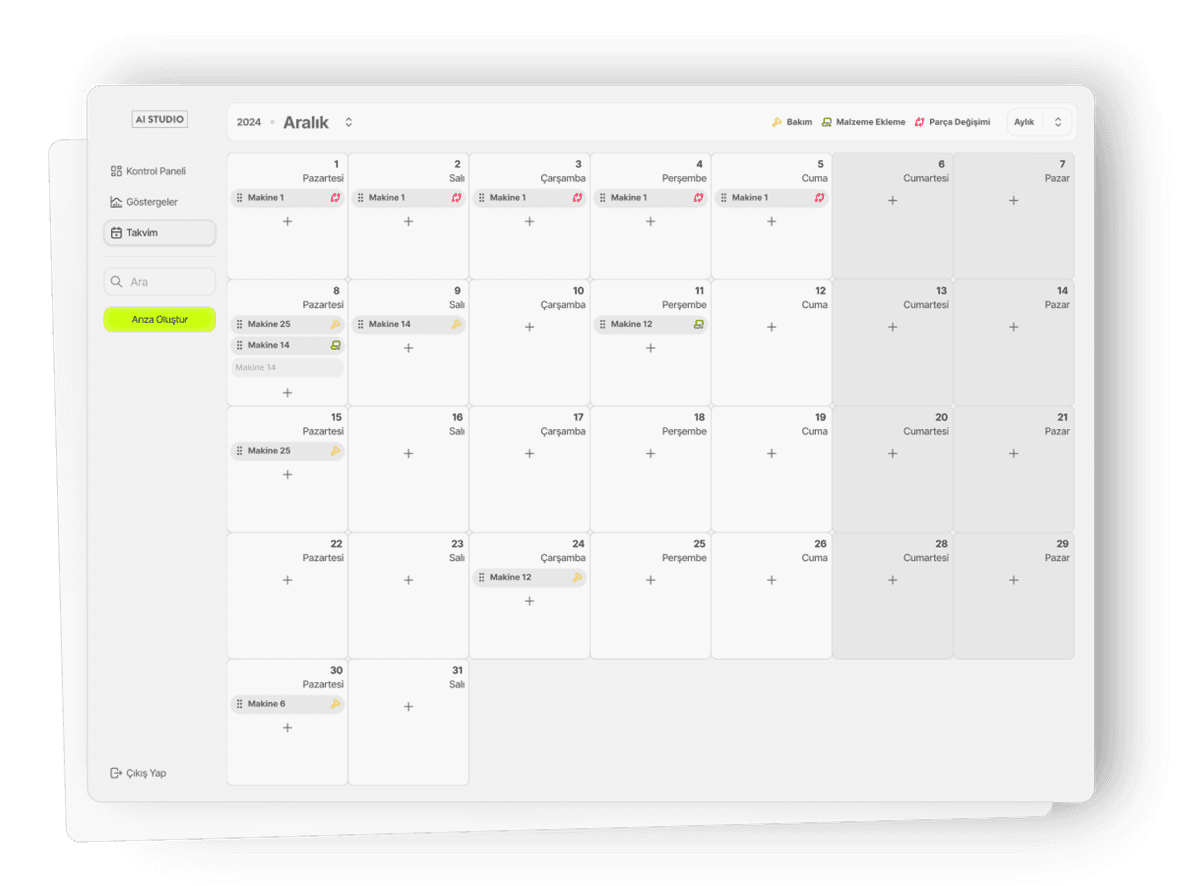 Aylık bakım takvimi ile makinelerin parça değişim, bakım ve malzeme ekleme günleri tahminlenir.