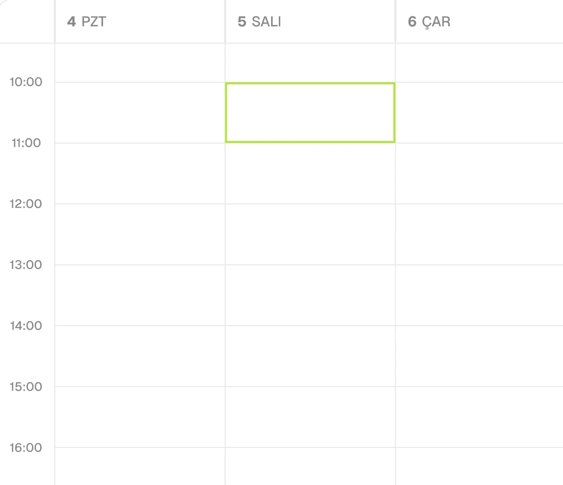 Mevcut Google, Outlook veya diğer takvim altyapınızla anlık olarak senkronize çalışır. Takviminizin gerçekten müsait olup olmadığını saniyeler içinde kontrol eder. Randevu onaylandığı anda, o slot anında tüm takvimlerinizde rezerve edilir.
